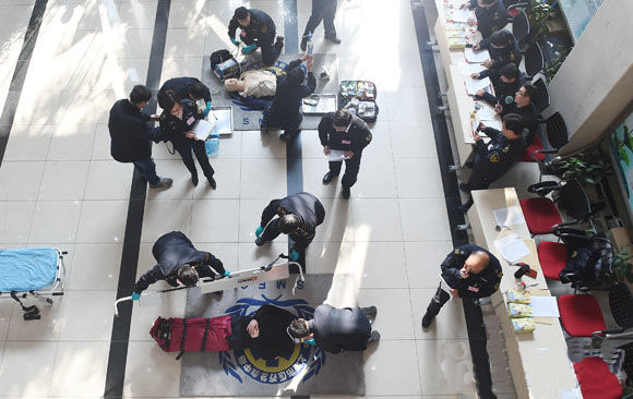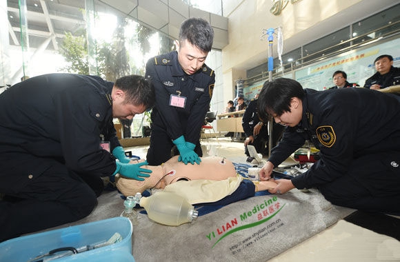 (救援人員正對(duì)傷員心肺復(fù)蘇模擬人進(jìn)行心肺復(fù)蘇等應(yīng)急處置)