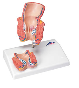 這款模型用來(lái)為病人解釋痔瘡的病理。實(shí)物大小,展示了直腸的前段。另外在基座上還有一稍微縮小一些的模型。除了直腸的一些解剖結(jié)構(gòu)(肛門(mén)括約肌、粘膜、靜脈血管網(wǎng)),它表現(xiàn)了1期和2期的內(nèi)痔,以及外痔。另外的小模型展示的是3期和4期的痔瘡。置于基架上。