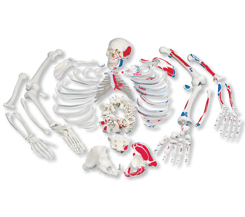這款特殊模型手工著色、編號(hào)。左半邊肌肉源用紅色,而附著肌用藍(lán)色。右半邊所有骨頭和骨結(jié)構(gòu)如裂縫、骨孔和骨突均用手工編號(hào)。頭顱可拆卸成三塊。一只手和一只腳用尼龍線連接,另一套手臂和腿為松動(dòng)。附送多種語(yǔ)言解碼卡來解釋600多種編號(hào)的解剖結(jié)構(gòu)。用堅(jiān)實(shí)分格儲(chǔ)藏盒包裝供貨。