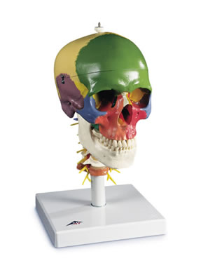 此款模型采用19種豪華色彩來展現(xiàn)頭顱各種骨片的形狀和關(guān)聯(lián)。豎于頸椎上并能靈活移動(C1, C2 及C7有色彩), 此款模型展示了菱腦、脊髓、頸椎神經(jīng)、脊椎動脈、基底動脈和后腦動脈。置于基架上。