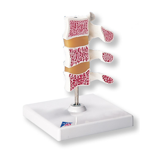 3塊中分腰椎,帶椎間盤。為作比較,上部為健康骨結(jié)構(gòu),中間為疏松骨組織,下部為帶平板變形和壓縮物質(zhì)的后階段疏松骨組織。椎骨可從基架上拆卸以便作細(xì)節(jié)研究。