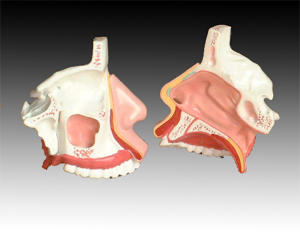 本模型適用于中等學(xué)校講解生理衛(wèi)生課程時(shí)作直觀教具用。使學(xué)生了解鼻腔的內(nèi)部構(gòu)造。顯示:1,外鼻:示鼻骨及鼻軟骨的切面。2,鼻腔:外側(cè)壁有上、中、下三個(gè)鼻甲突入鼻腔,形成上、中、下三個(gè)鼻道。3,鼻副竇:示額竇、蝶竇和上頜竇。本模型按實(shí)物放大1/2倍。用PVC制成。
