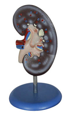 本模型適用于中等學校講解人體解剖有關泌尿器官課程時作直觀教具用。右腎作額狀切面,示腎門、腎血管、輸尿管和腎盂、腎實質(zhì)分髓質(zhì)及皮質(zhì)、錐體、乳頭等。用PVC制成,安放于塑料座上。本模型放大2倍,尺寸: 20x10x7CM。