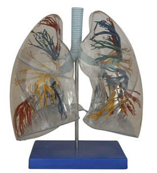 本模型供醫(yī)學院校講解人體解剖學、胸外科和內(nèi)科等課程時作直觀教具用。顯示左右兩肺的分段,左肺八個段,右肺十個段,從透明肺殼可以觀察支氣管樹的分布情況。本模型肺外形用透明塑料制,氣管和支氣管樹用塑料制。用PVC制成,安放于塑料座上。2倍放大。