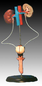 本模型為中等學(xué)校生理衛(wèi)生課程的直觀教具。幫助學(xué)生了解泌尿生殖系統(tǒng)主要臟器的外形和腎臟、膀胱、陰莖和睪丸的構(gòu)造。用PVC制成,安放于塑料座上。