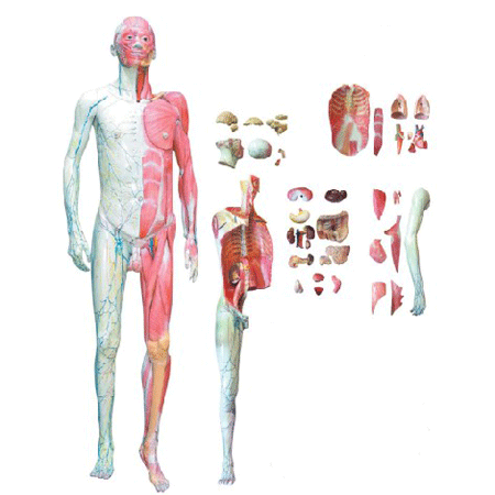 該模型由男性頭頸部、軀干和四肢組成,示人體全身肌肉、全身血管神經(jīng),大部分肌肉及全部?jī)?nèi)臟能拆下示教。