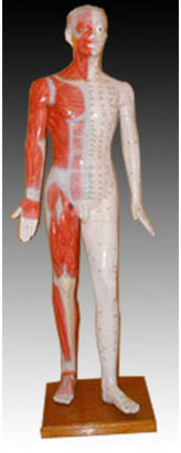 這款彩色的塑料模型非常詳細(xì)地標(biāo)明了14條主要經(jīng)絡(luò)線,身體右側(cè)是361個(gè)經(jīng)穴和48個(gè)經(jīng)外穴以及骨度線,即用“寸”來方便地測(cè)量針灸點(diǎn)之間的距離。身體左側(cè)是皮下組織,顯示神經(jīng)系統(tǒng)分布、動(dòng)靜脈、血管和肌肉構(gòu)造,還標(biāo)明了在主要經(jīng)絡(luò)線上沒有標(biāo)明的手足部的經(jīng)外穴。適用于中醫(yī)教學(xué)、針灸和推拿等。用玻璃鋼制成。尺寸:178CM高。
