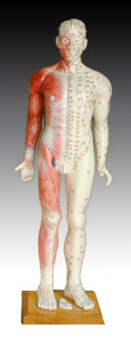 這款彩色的塑料模型非常詳細(xì)地標(biāo)明了14條主要經(jīng)絡(luò)線,身體右側(cè)是361個(gè)經(jīng)穴和48個(gè)經(jīng)外穴以及骨度線,即用“寸”來(lái)方便地測(cè)量針灸點(diǎn)之間的距離。身體左側(cè)是皮下組織,顯示神經(jīng)系統(tǒng)分布、動(dòng)靜脈、血管和肌肉構(gòu)造,還標(biāo)明了在主要經(jīng)絡(luò)線上沒(méi)有標(biāo)明的手足部的經(jīng)外穴。適用于中醫(yī)教學(xué)、針灸和推拿等。用PVC制成。尺寸:84CM高。