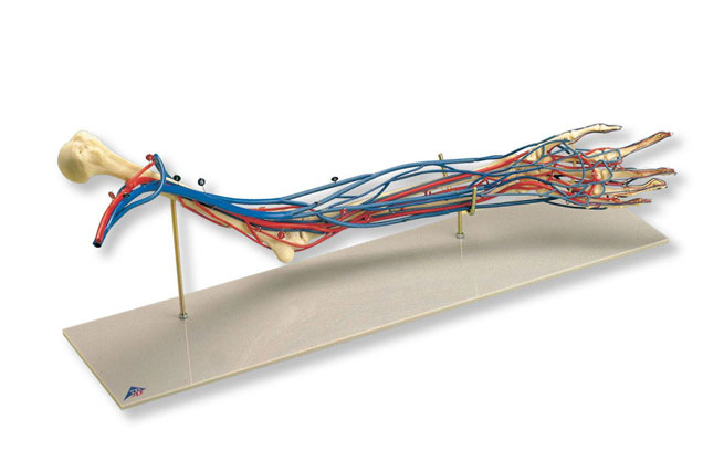 實(shí)物大小的左臂和左手,半屈,包括腕動(dòng)脈、橈骨動(dòng)脈、尺骨動(dòng)脈并伴有根定點(diǎn)靜脈。手部的整個(gè)血液循環(huán)系統(tǒng)在手心和手背都作顯示。不同血管的大小對(duì)比關(guān)系清晰,簡(jiǎn)化了對(duì)手臂血液循環(huán)的學(xué)習(xí)和研究。 置于基架上。