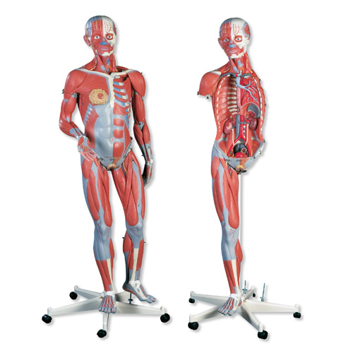 高度138厘米,是實(shí)物的3/4,除精確詳解人體主要神經(jīng)、血管、組織和器官外,復(fù)制了人體表層和深層肌肉結(jié)構(gòu)。內(nèi)臟可拆卸(共45塊)以展現(xiàn)人類形態(tài)學(xué)的基本聯(lián)系。打開(kāi)顱蓋可觀察內(nèi)部顱結(jié)構(gòu)和可拆成3部分的腦。肝下方可見(jiàn)肝囊和膽管�?筛Q見(jiàn)腸、胃、肺、心臟和腎,臂和腿的13塊不同肌肉可拆卸觀察。還可替換各生殖器插件及女性乳腺。662個(gè)解剖結(jié)構(gòu)諸如肌肉、血管、神經(jīng)和器官被編碼,并附多種語(yǔ)言的說(shuō)明。 形象逼真的手工著色,并置于實(shí)用的旋轉(zhuǎn)基架上。還可分拆成: