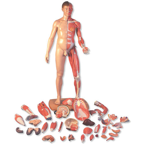 此款真人大小高質(zhì)量模型精確詳盡地展示了各種人體解剖結(jié)構(gòu),因而特別適用于醫(yī)學(xué)院的高要求教學(xué)。右半部顯示皮膚、左半部顯示表層和深層肌肉和神經(jīng),血管和骨組織。此款模型美觀多用,對(duì)內(nèi)臟器官的精確模仿使之趨臻完美。還可分拆成: