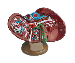 打開的肝臟內(nèi),完整的血管網(wǎng)用不同顏色表示: •門血管 •肝內(nèi)肝外膽管 •膽囊 置于可拆卸基架上。
