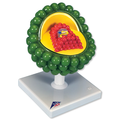 這款放大了數(shù)百萬(wàn)倍的艾滋病毒模型展示了其外質(zhì)膜及蛋白結(jié)構(gòu)。包含RNA的內(nèi)體可拆卸。為介紹有效的預(yù)防艾滋病措施,模型還可安上避孕套。置于基板上供貨,無(wú)避孕套。