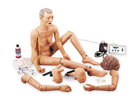 這款模型為老年人外貌,性別可轉(zhuǎn)換�?晒┻M(jìn)行基本和高級(jí)護(hù)理措施的練習(xí),包括插管練習(xí)。右臂靜脈可供練習(xí)肌肉注射,在觸診時(shí)在皮膚下卷起。針刺位置正確時(shí)會(huì)做確認(rèn),肩部也能作肌肉注射練習(xí)。左臂帶有血壓功能,并產(chǎn)生5個(gè)Korotkoff音。另外,指導(dǎo)教師還可自行設(shè)置心臟收縮和舒張水平、脈搏頻率、音量和聽(tīng)診間隙。 模型還表現(xiàn)了皮膚上的皺紋、變紅的皺褶、擴(kuò)大的瞳孔、骶骨褥瘡(I期)、一個(gè)正常的和一個(gè)癌變的痣。頸部和其他主要關(guān)節(jié)可擺成人類(lèi)的各種自然姿勢(shì)。手和腳由柔軟有彈性的材料制成,使其更為逼真。提供手提箱�?删毩�(xí)下列護(hù)理技術(shù):
