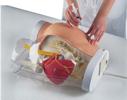 這款非常獨(dú)特的人體臀部模型具有合二為一的功能:右側(cè)透明,可見(jiàn)解剖結(jié)構(gòu)如骨、骼嵴、大腿骨、臀肌、神經(jīng)和靜脈等; 操作者可將所見(jiàn)到的神經(jīng)和靜脈等組織在頭腦中 “轉(zhuǎn)移”到左邊,然后練習(xí)注射。通過(guò)觸摸柔軟的皮膚可幫助確定注射部位,注射時(shí)可注入液體(水)。位置正確亮綠燈,位置錯(cuò)誤或入針太深,亮紅燈并響警示笛。