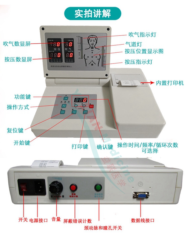 ■ 電子監(jiān)測:電子指示燈顯示監(jiān)測氣道開放和按壓部位。人工呼吸和胸外按壓的正確次數(shù)計數(shù)和錯誤次數(shù)計數(shù)。