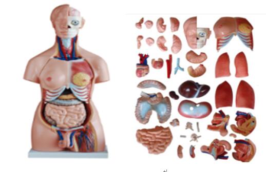 這款兩性軀干模型分成40件:軀干,女性胸腔蓋,頭,眼球,腦(8件),脊椎神經(jīng)(4件),肺(4件),心(2件),氣管,食管和主動(dòng)脈,橫膈膜,肝,腎,胃(2件),腸(4件),男性生殖器官(4件)和女性生殖器官帶胎兒(3件)。用PVC制成,安放于塑料座上。尺寸:85cm。