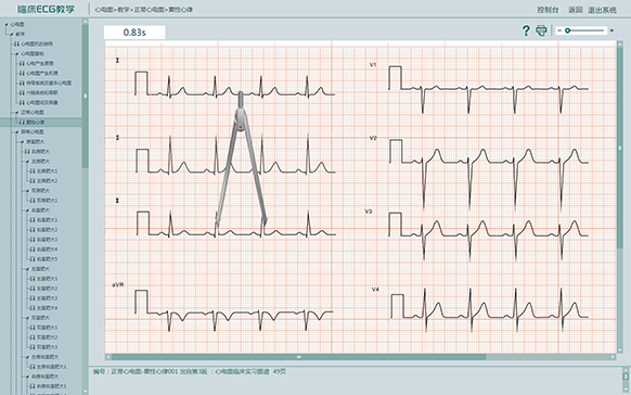 2. 臨床ECG教學(xué)系統(tǒng)重點(diǎn)突出學(xué)生的能力培養(yǎng),每幅心電圖均有自動(dòng)測量尺,學(xué)生可任意測量心電圖各波段的電壓(振幅)、時(shí)間、ST段升高與降低的幅度,整幅心電圖的心律與節(jié)律,測量后自動(dòng)匯報(bào)測量數(shù)據(jù),學(xué)生可獨(dú)立找出該幅心電圖的特征,并可與課件中所描述的心電圖特征相比較,提供學(xué)生在真實(shí)病人的心電圖上獨(dú)立測量、獨(dú)立分析、獨(dú)立做出診斷的強(qiáng)化訓(xùn)練方法,培養(yǎng)學(xué)生正確的心電圖診斷思維。