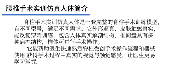 腰椎手術(shù)實訓仿真模擬器"/> 是一套完整的腰椎椎間孔內(nèi)窺鏡微創(chuàng)手術(shù)訓練模型,它能幫助醫(yī)生快速熟悉腰椎內(nèi)窺鏡微創(chuàng)手術(shù)操作流程和器械使用,獲得手術(shù)過程中真實的視覺與觸覺感受,讓醫(yī)生學習曲線更陡峭 。歡迎閣下致電021-64188321了解更多!"/>