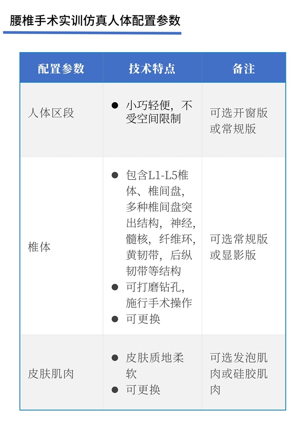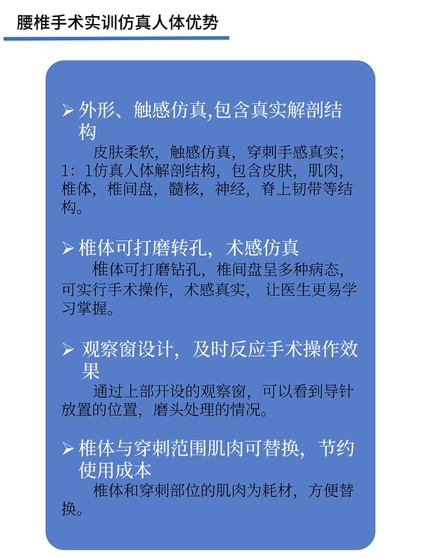 是一套完整的腰椎椎間孔內(nèi)窺鏡微創(chuàng)手術(shù)訓練模型,它能幫助醫(yī)生快速熟悉腰椎內(nèi)窺鏡微創(chuàng)手術(shù)操作流程和器械使用,獲得手術(shù)過程中真實的視覺與觸覺感受,讓醫(yī)生學習曲線更陡峭。 手術(shù)訓練術(shù)式技能點: 1.1、椎間孔鏡手術(shù)。 1.2、錐體成形術(shù)。 1.3、經(jīng)皮釘棒融合手術(shù)。 1.4、椎間融合器植入手術(shù)。 腰椎微創(chuàng)手術(shù)實訓仿真人體模擬器 1.1、外形尺寸:26.5*31*13CM,小巧輕便,不受地點限制,在家也能練習。 1.2成年人體格外觀,包含1:1真實人體解剖結(jié)構(gòu),如皮膚、肌肉、L1-L5腰椎、椎間盤、神經(jīng),髓核,纖維環(huán),黃韌帶,后縱韌帶等結(jié)構(gòu)。 1.3、皮膚為特有材料配方硅膠,外形高仿真,肌肉線條分明,邵氏硬度10±2,觸摸感接近正常人體觸摸感,術(shù)感真實,可穿刺、切割,縫合。 1.4、錐體主體材料為特有材料配方聚氨酯,可打磨鉆孔進行手術(shù)操作。 1.5、椎間盤材料為特有材料配方硅膠,邵氏硬度5 ±2,具有多種突出病態(tài),可進行髓核鉗操作。 1.6、錐體、穿刺范圍的肌肉為為耗材,能多次使用,同時可方便更換。 基本配置 1.基本配置 1.1、腰椎人體區(qū)段1個; 1.2、錐體1個; 1.3、發(fā)泡肌肉1套;