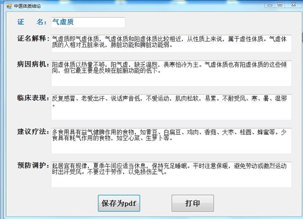 中醫(yī)體質(zhì)辨識系統(tǒng)根據(jù)中華中醫(yī)藥學(xué)會(huì)2009年發(fā)布的《中醫(yī)體質(zhì)分類與判定》,中醫(yī)體質(zhì)共分為9種基本類型:平和質(zhì)、氣虛質(zhì)、陽虛質(zhì)、陰虛質(zhì)、痰濕質(zhì)、濕熱質(zhì)、瘀血質(zhì)、氣郁質(zhì)、 特稟質(zhì)。不同體質(zhì)類型在形體特征、生理特征、心理特征、病理反應(yīng)狀態(tài)、發(fā)病傾向等方面各有特點(diǎn)。 該軟件以《中醫(yī)體質(zhì)辨識判定》標(biāo)準(zhǔn)為基礎(chǔ),通過軟件智能化判斷,自動(dòng)生成體質(zhì)報(bào)告,通過癥名解釋、病因病機(jī)和臨床表現(xiàn)得出建議療法和預(yù)防調(diào)護(hù)等建議。適用于各級體檢中心、中醫(yī)臨床輔助診斷、社區(qū)衛(wèi)生服務(wù)中心、藥店、中醫(yī)保健養(yǎng)生會(huì)所、學(xué)校、科研等場所。