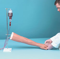 Unique in quality and design, this injection arm allows for realistic training and increased competence of medical staff. Also suitable for group instruction, the arm is made of high quality, and easy-to-clean soft material. Intravenous injection can be practiced as well as the correct puncture of peripheral veins for blood sampling and positioning of a venous catheter. Intramuscular injection (without liquid) can also be practiced. Includes stand, artificial blood, plastic bottle, syringe, and deluxe storage carton.